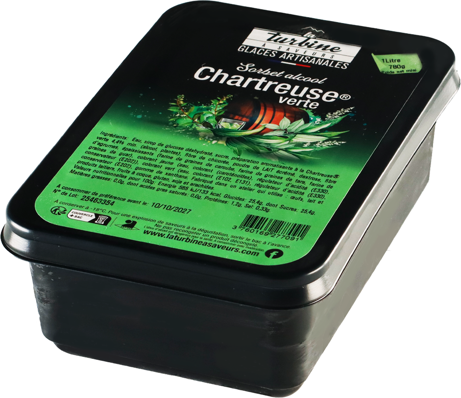 Découvrez une expérience unique avec notre sorbet artisanal à la Chartreuse Verte, une création audacieuse et raffinée signée La Turbine à Saveurs. Élaboré avec l’emblématique liqueur de Chartreuse®, ce sorbet révèle des notes végétales et aromatiques sublimées par une texture légère et rafraîchissante. Nos artisans glaciers associent la fraîcheur de la Chartreuse® à une recette artisanale équilibrée, idéale pour surprendre vos invités ou conclure un repas sur une note originale et élégante.